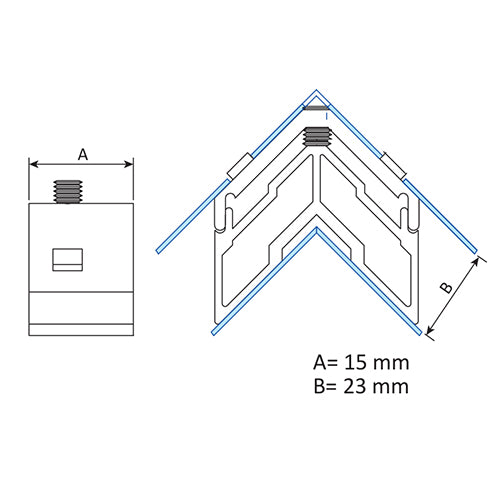Escuadra de teton fijo de 23x15mm para hoja y marco de serie perimetral de 70 mm y corte recto.