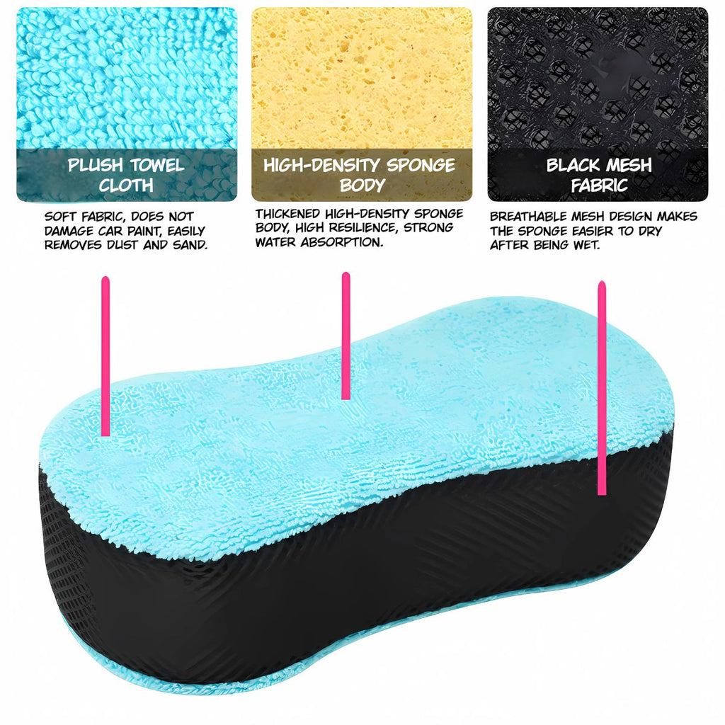 - Cuerpo de esponja espesa y flexible garantiza una alta retención de agua y espuma, lo que permite una limpieza eficiente con menor esfuerzo y consumo de producto.
