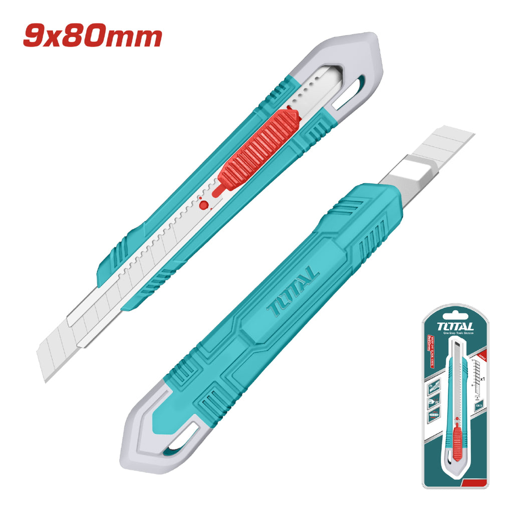 Exacto a Presion de 9 mm x 80 mm. De Longitud: 135 mm. Con Auto bloqueo y pulsador plano. Trae 1 cuchilla ( THT5190901 ).