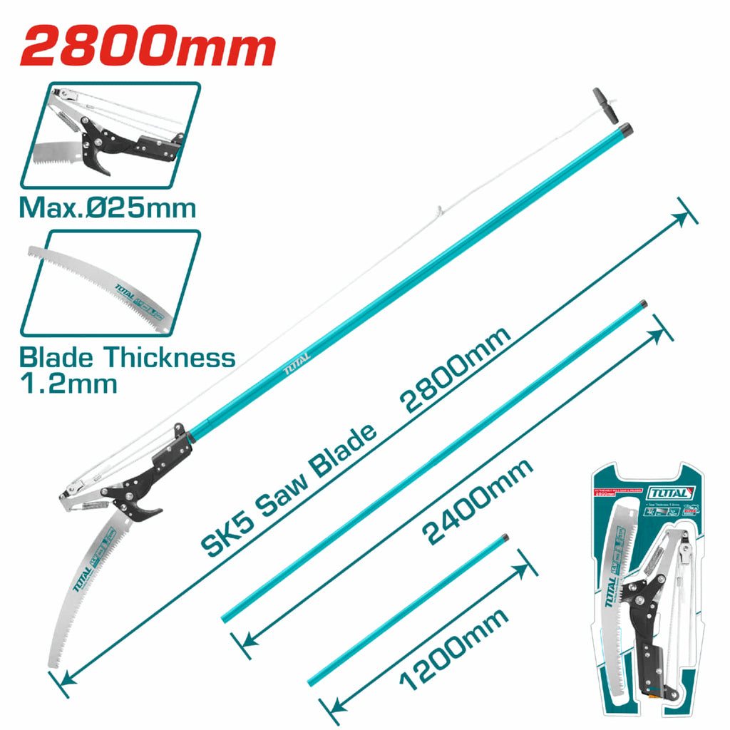Sierra para Podar 25mm. Sk5 Dientes Triples Rectificados de Precisión (3 bordes). Barra telescópica de acero extensible en dos partes hasta 2.8m. Hilo de nilón de 2.7m y 1.2mm de diámetro. Diseño de doble rueda. Sierra pintada con teflón y tratamiento térmico. Presentación blíster.