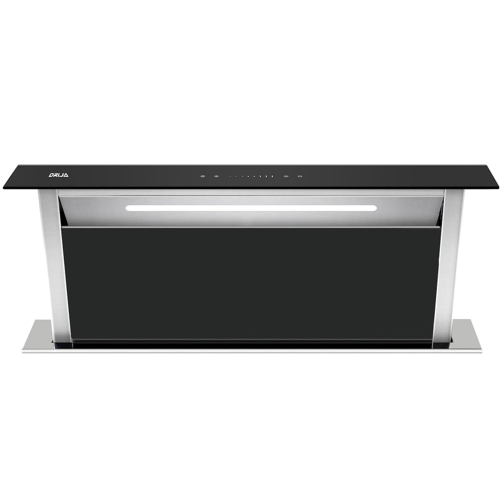 Extractor de grasa empotrable de 88 cm. Color inox con panel de vidrio templado negro. Modelo Arco Isla 90 Drija