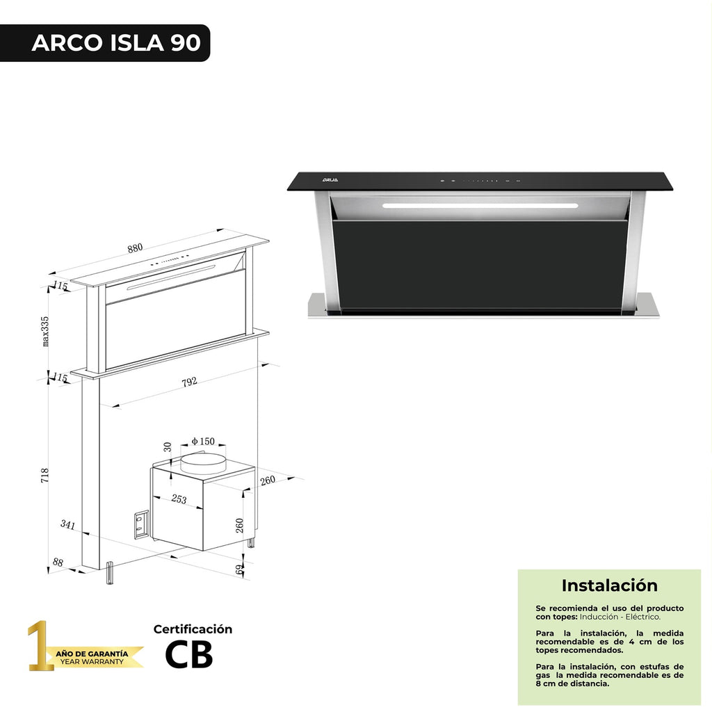 | *Nombre | Extractor de grasa empotrable de 88 cm. Color inox con panel de vidrio templado negro. Modelo Arco Isla 90 Drija |