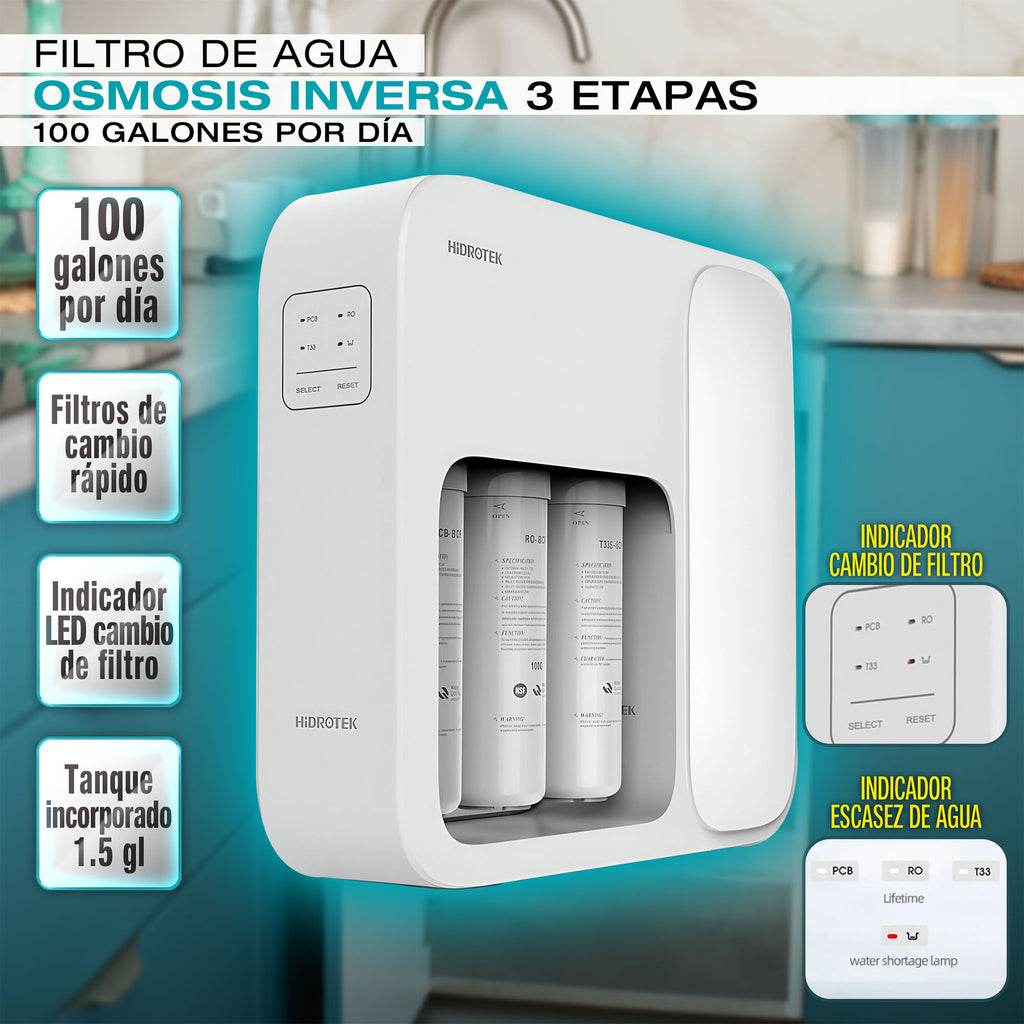 Filtro de agua con Osmosis Inversa de 3 etapas con tanque integrado.