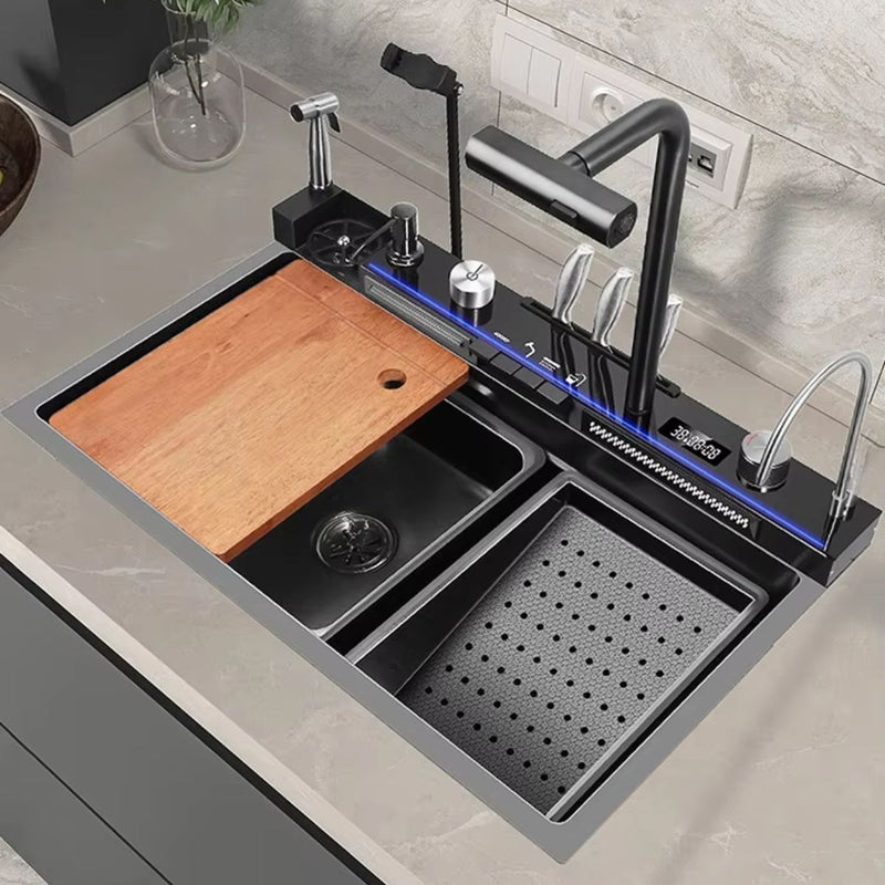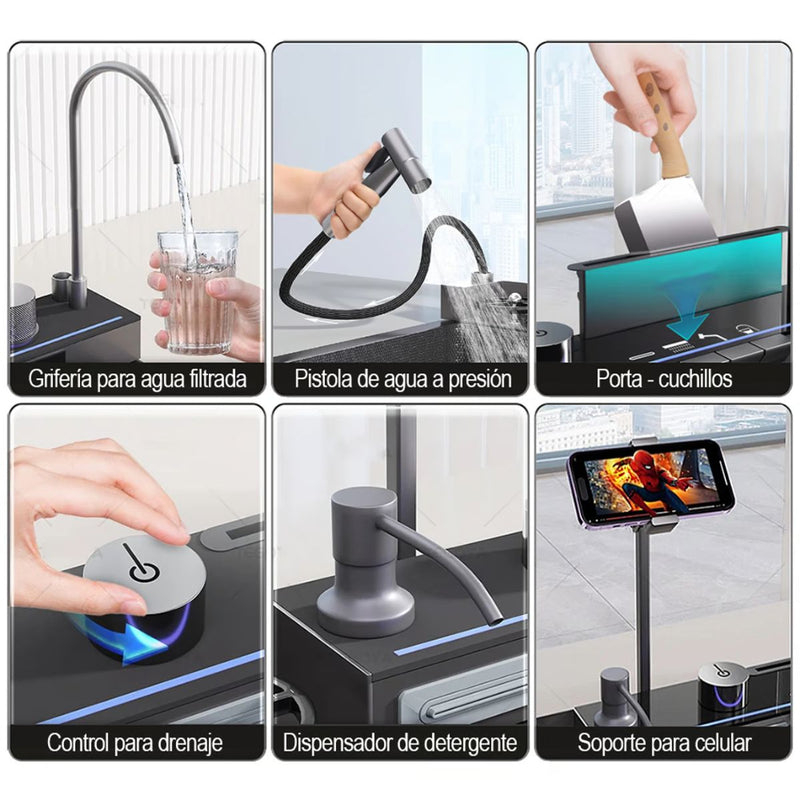 - Ideal para cocinas modernas: Perfecto para quienes buscan un fregadero estético y multifuncional que combine tecnología y practicidad.