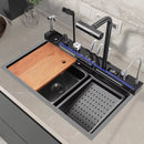Fregador De Cocina Multifunción empotrable. 75x46x22cm. De doble cascada con soporte para celular. Acero inoxidable.