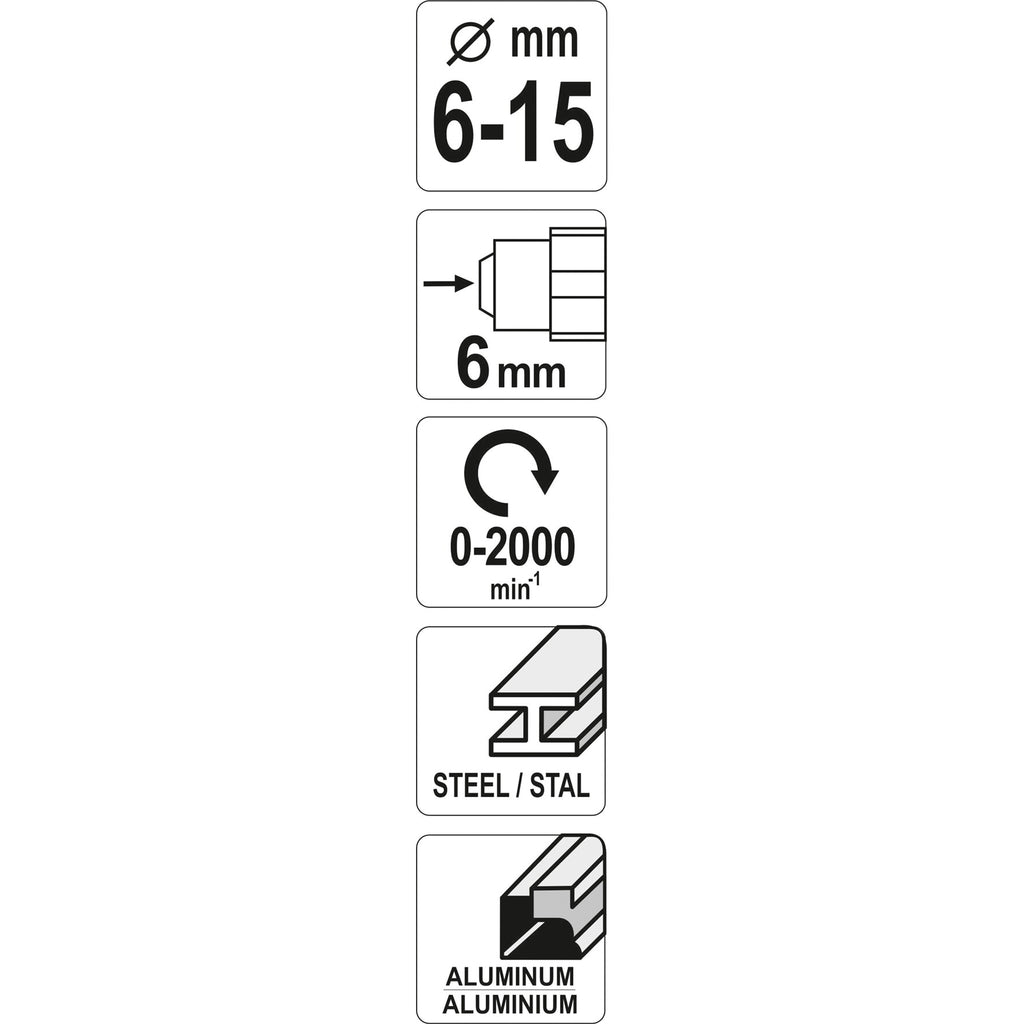 TAMAÑO: 6-15MM; ACERO AL CARBONO CON TRATAMIENTO TÉRMICO PARA METAL; VELOCIDAD MÁXIMA: 2000RPM; SHANK: 6 MM
