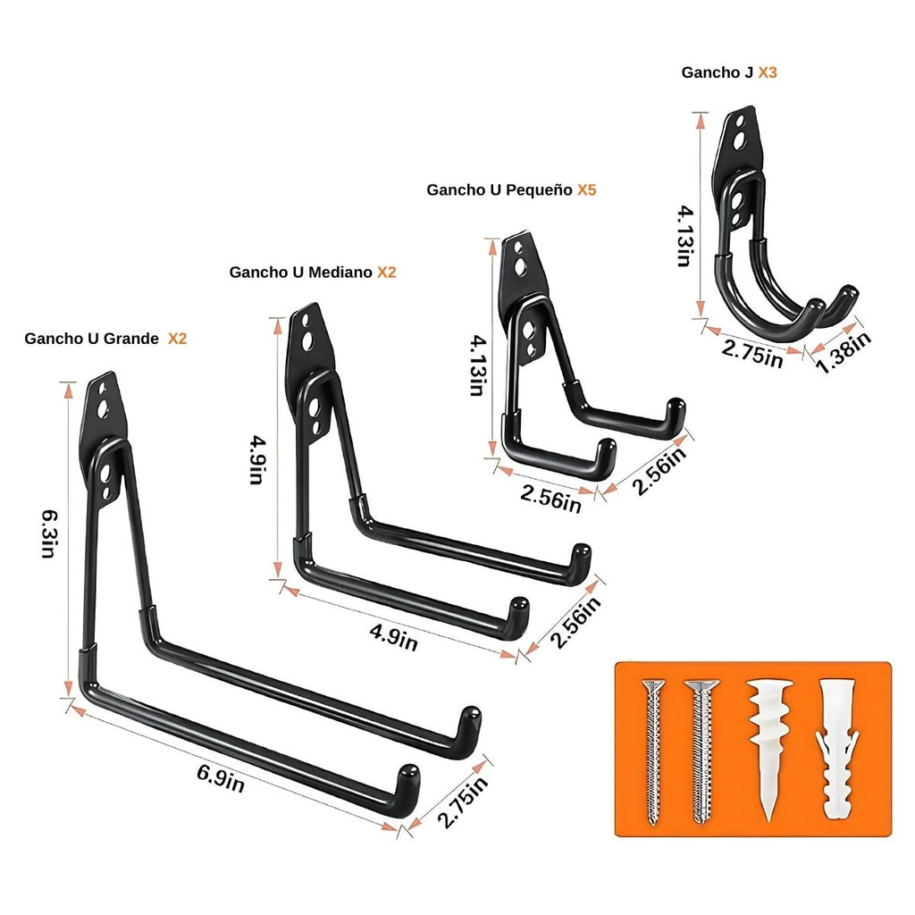 Ganchos De Soporte Metálicos Revestimiento PVC Para Herramientas Y Organización. Soporte para Colgar Bicicletas, Escaleras. Set 12 piezas.