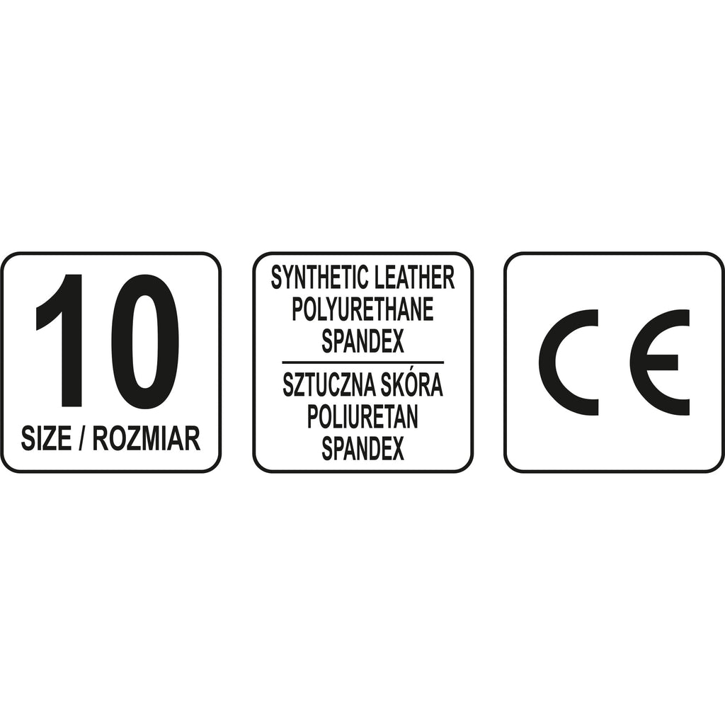 10, MATERIAL: PALMA DE CUERO SINTÉTICO, TEXTIL, ALTA RESISTENCIA A LA ABRASIÓN, LÍNEAS DE COSTURA DOBLES, NUDILLO DE NEOPRENO FLEXIBLE, PUÑOS DE BANDA ELÁSTICA Y AJUSTE DE GANCHO Y LAZO, CADA GUANTE CON COSTURA EN LA ETIQUETA DE LAVADO, COLOR: ROJO, NEGRO