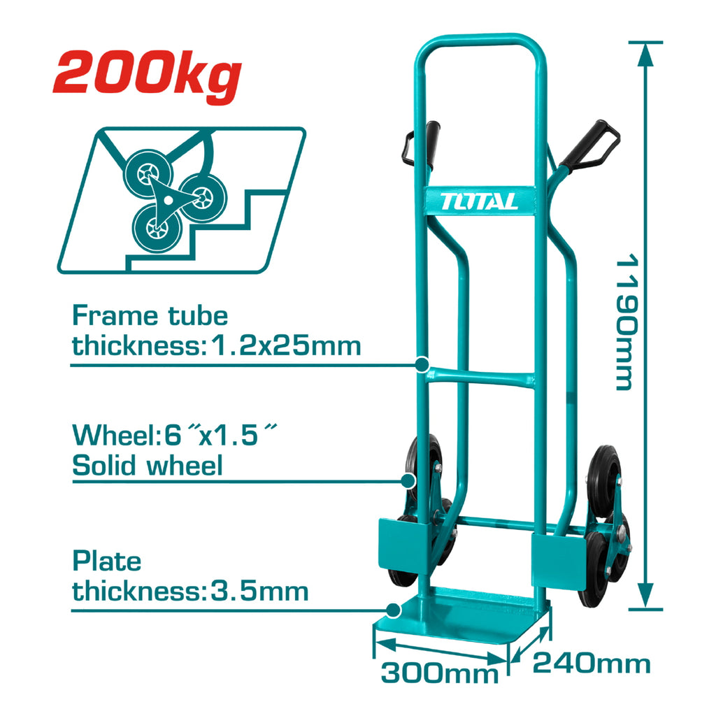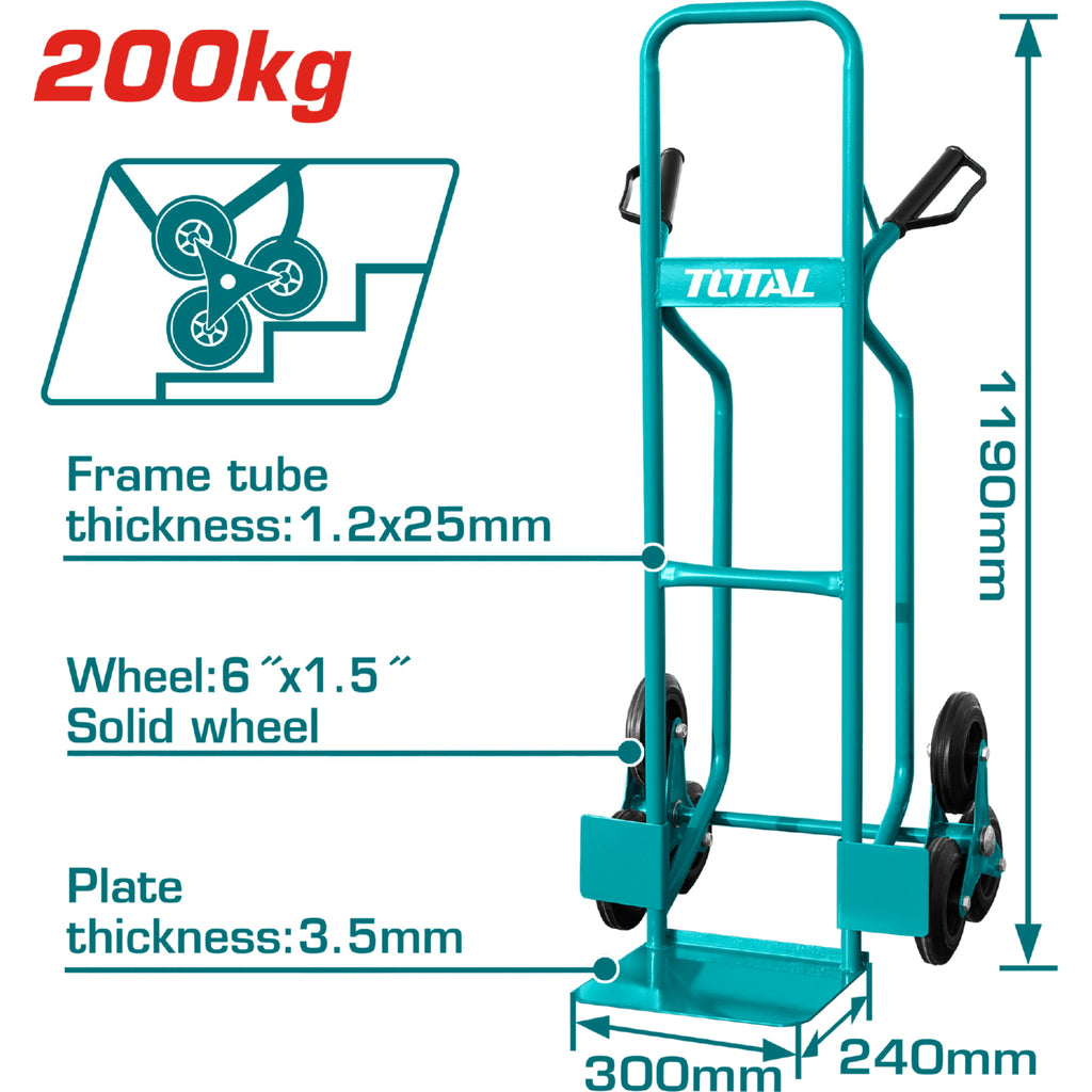 Carretilla, Turquesa, Capacidad de 200kg. 6 ruedas solidas 6 x 1.5'''' y 150mm de diámetro. Plancha 240 x 300mm con espesor de 3.5mm. Medidas L / H / W : 620 x 1190 x 510 mm. Presentación envuelta en cartón.