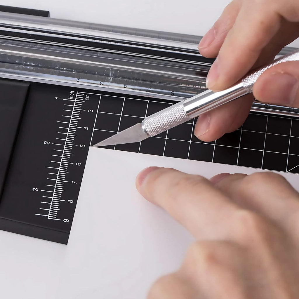 - Cúter de precisión con cuchillas intercambiables para cortes limpios y detallados.