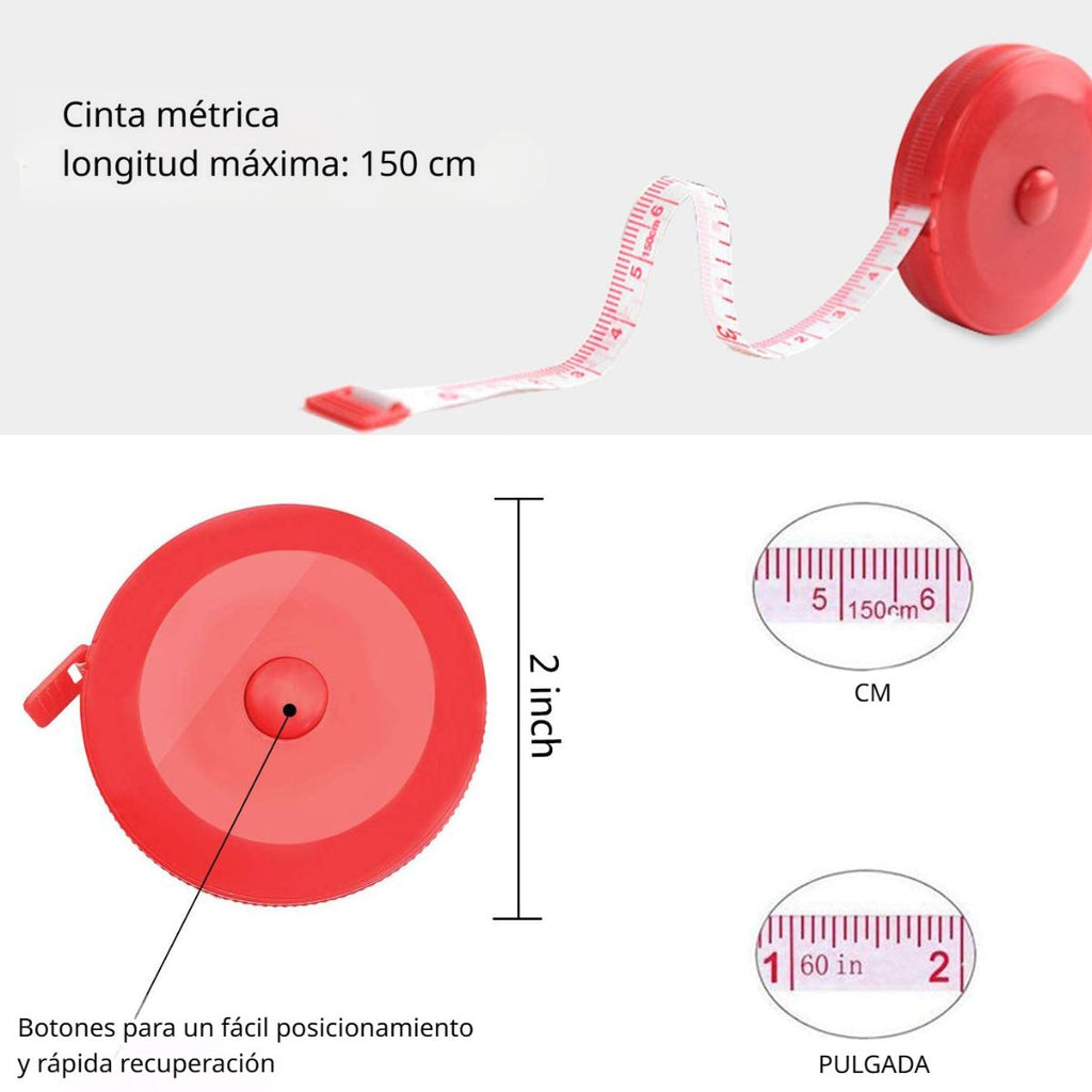 - Cinta métrica retráctil de 150 cm con doble escala en pulgadas y centímetros para mediciones exactas.