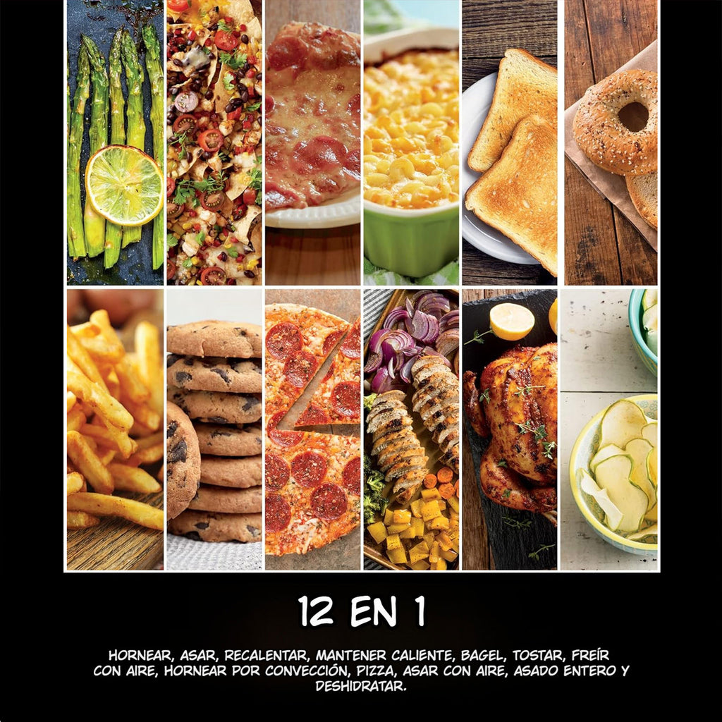 - 12 en 1: Hornear, asar, recalentar, mantener caliente, bagel y tostar en el horno rápido superior. Freír al aire, hornear por convección, pizza, asar al aire, asar entero, y deshidratar en el horno de convección inferior y freír al aire.
