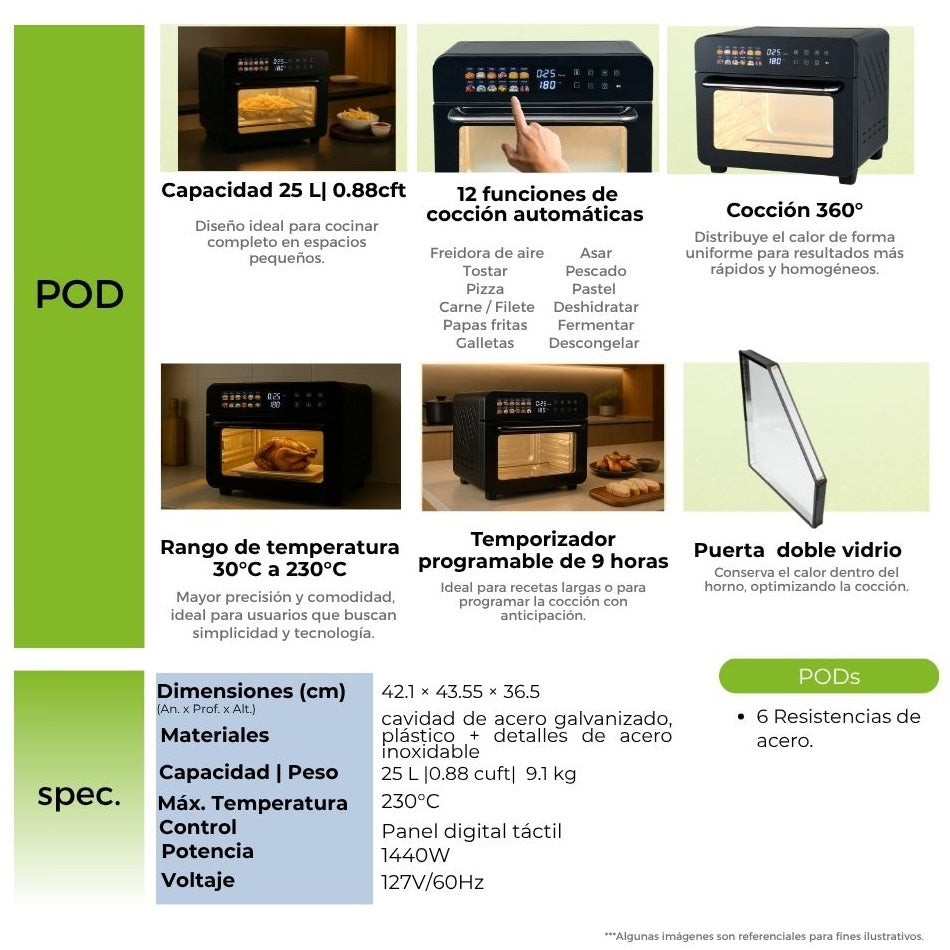 | *Nombre | Horno eléctrico y freidora de aire de 25 litros con 12 funciones. Color negro, modelo Bruschetta Drija |