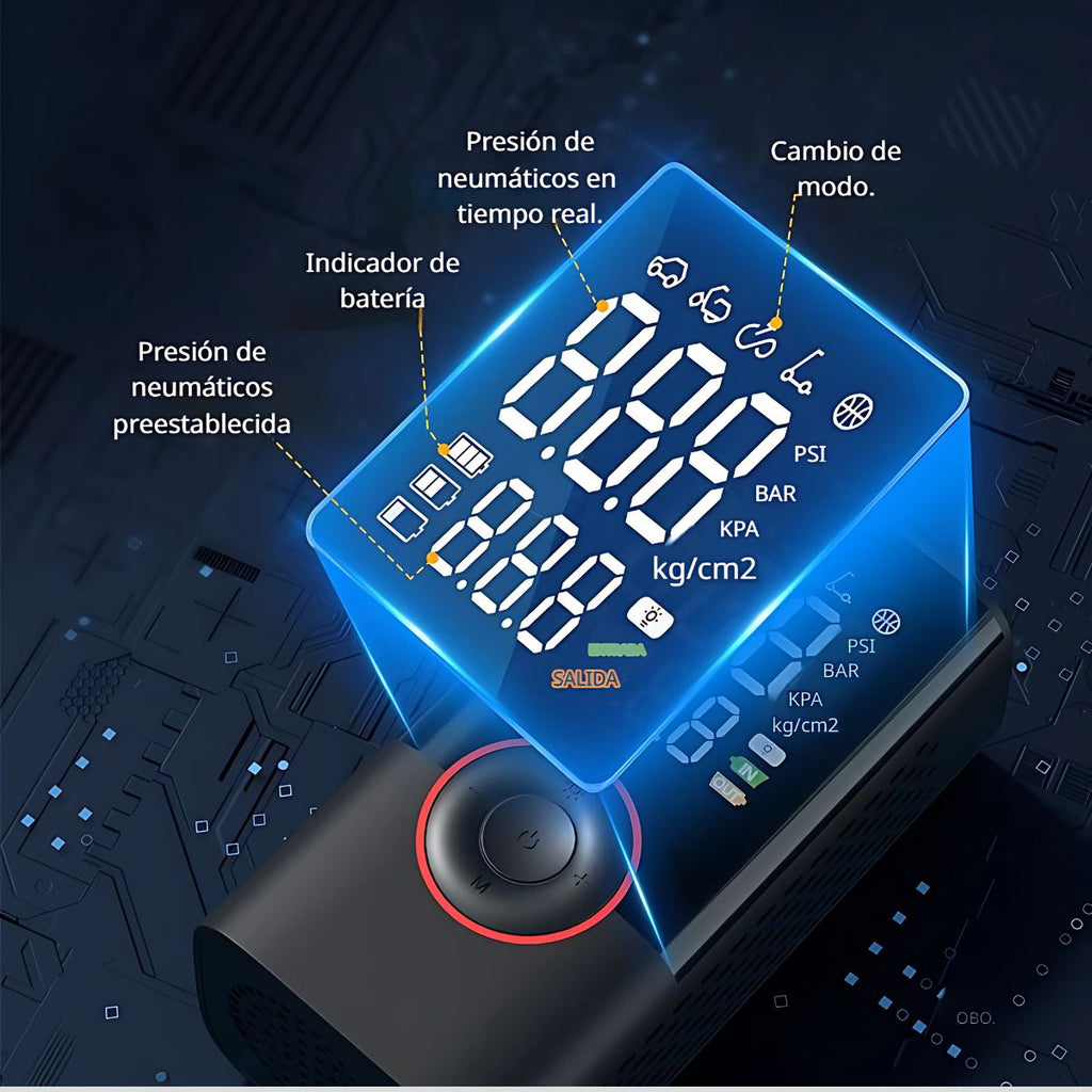 - Potente compresor digital de 80W para inflado rápido de neumáticos, bicicletas, motos, pelotas y más.