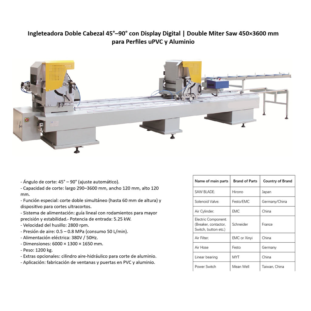 | *Nombre | Ingleteadora Doble Cabezal 45°–90° con Display Digital | Double Miter Saw 450×3600 mm para Perfiles PVC y Aluminio |