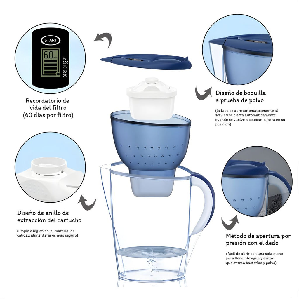 - Indicador de vida del filtro con duración aproximada de 60 días por cartucho.
