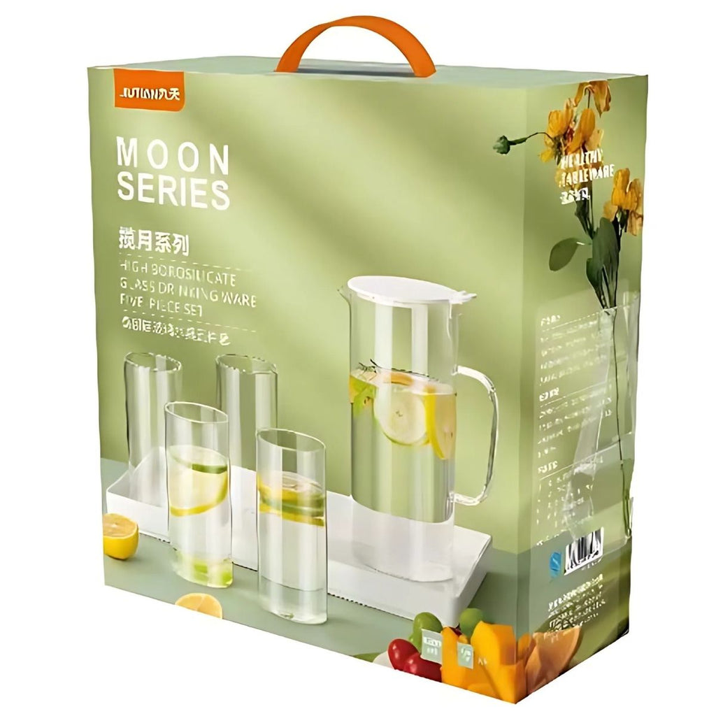 - Set de 5 piezas compuesto por jarra con tapa y vasos de vidrio resistente.