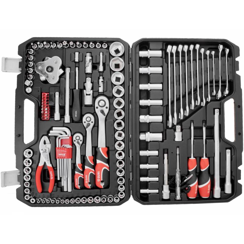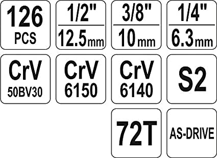 | Incluye | 126 piezas de herramientas : Vasos,Llaves para filtro de aceite,Llaves Allen,Alicates,Destornilladores de Impacto,Llaves semi abiertas,Llaves de Estrella |