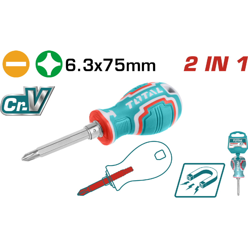 Juego de Destornilladores 2 en 1 con Mango Intercambiable. Cr-V. Tamaños de los Vastagos destornilladores: 6.3 x 75 mm.Destornilladores: PH2 + SL6.