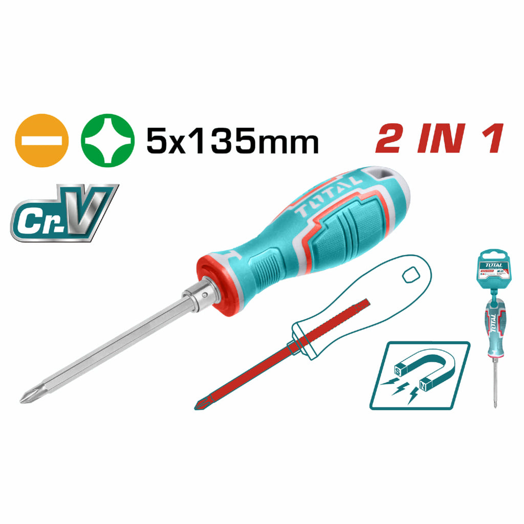 Juego de Destornilladores 2 en 1 con Mango Intercambiable. Cr-V. Tamaños de los Vastagos destornilladores: 5 x 135 mm.Destornilladores: PH1 + SL5.