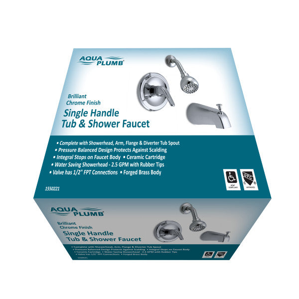 Kit de ducha con acabado cromado brillante para tina. Incluye cabezal de ducha, manija y grifo.