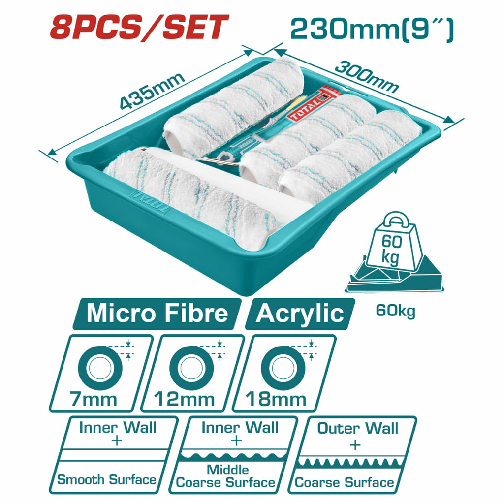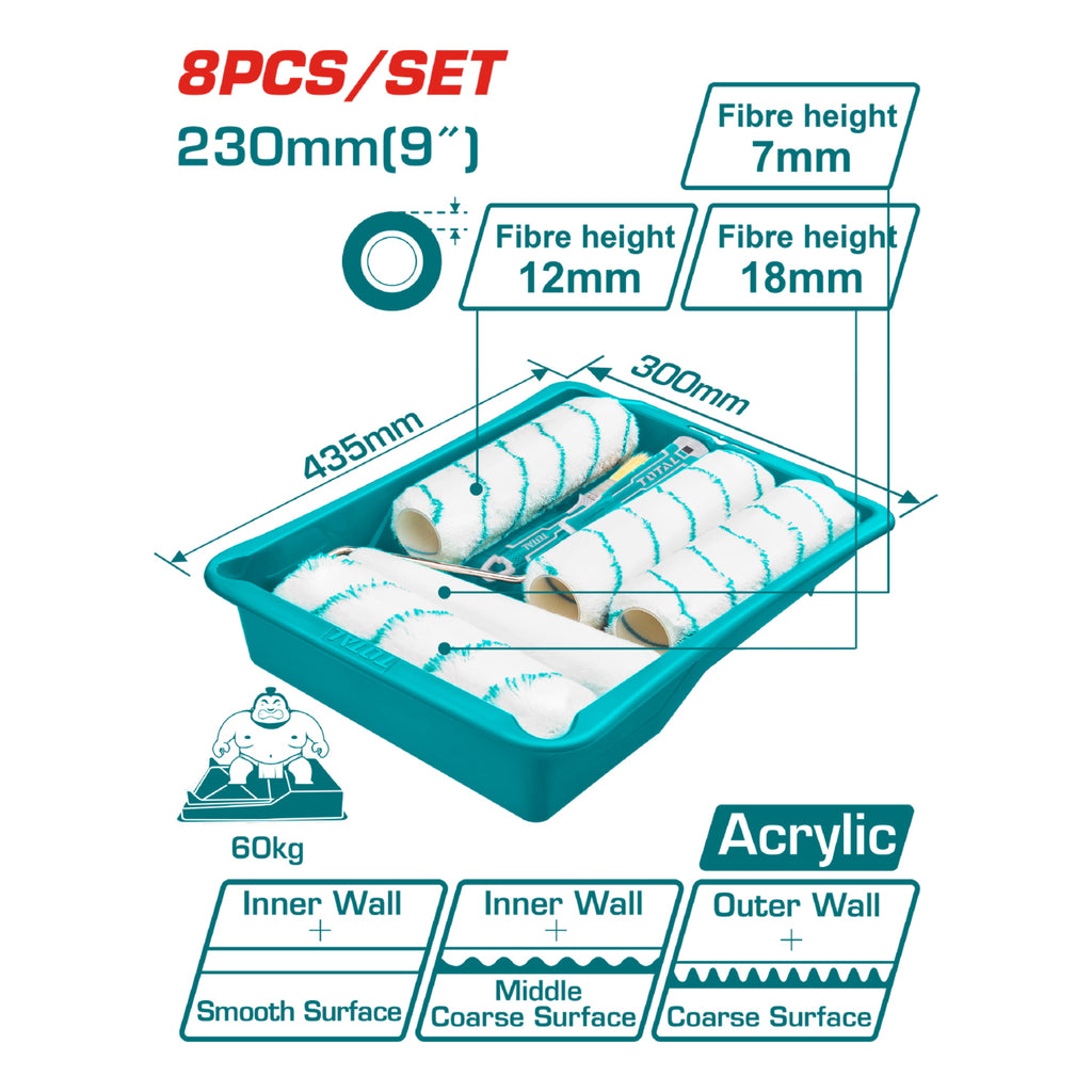 Juego de Rodillos para pintar 8 en 1 con bandeja de pintura. Para Interiores y Exteriores. 1 Rodillo 230 mm (9''). Espesor 7mm. 3 Rodillos 230 mm (9''). Espesor 12 mm. 1 Rodillo 230 mm (9''). Espesor 18 mm. 1 Rodillo 230 mm (9''). Espesor 7mm. 1 Soporte para Rodillos de 230 mm (9''). 1 Pincel de Diseño de 25 mm (1''). 1 Bandeja de 435 x 300 x 75 mm.