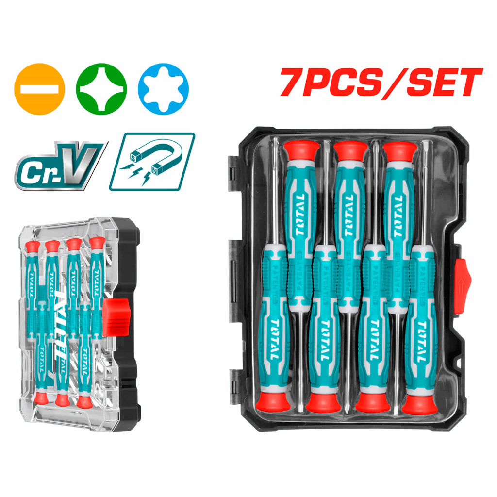 Juego Destornillador de precision (7pza)incluye:SL2.0*50, SL2.5*50, SL3.0*50, PH00*50, PH0*50, T6*50, T8*50 Material: CR-V.