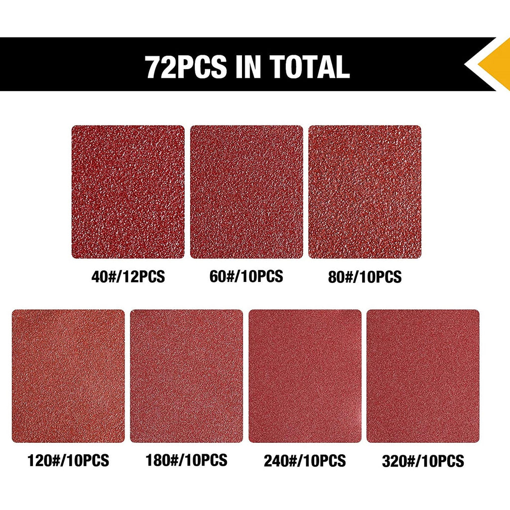 72 piezas de discos de lija de 8 agujeros de 5Pulg y 7 granos diferentes de grueso a fino.
