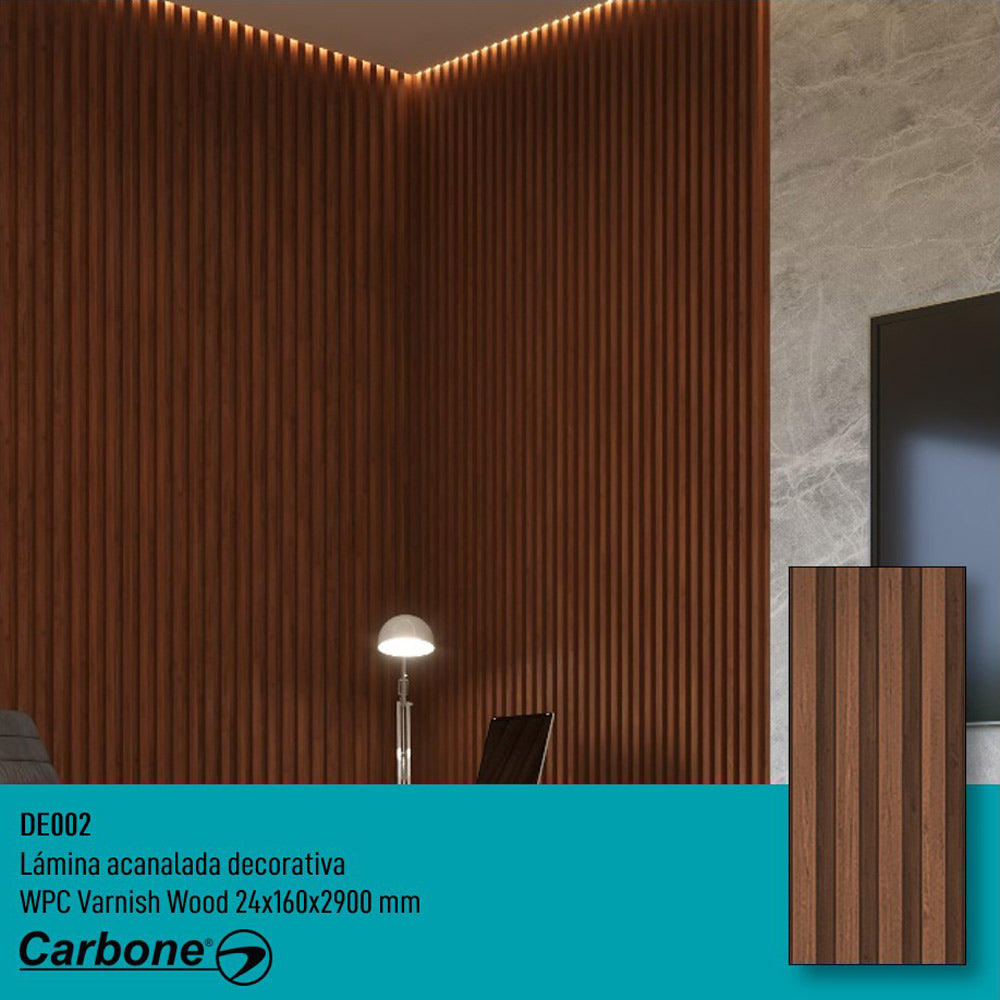Lámina acanalada decorativa WPC Varnish wood 24x160x2900 mm -Compuesta por madera y PVC resistente al calor, humedad, y arañazos.