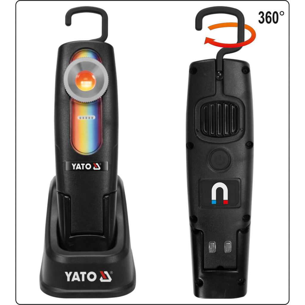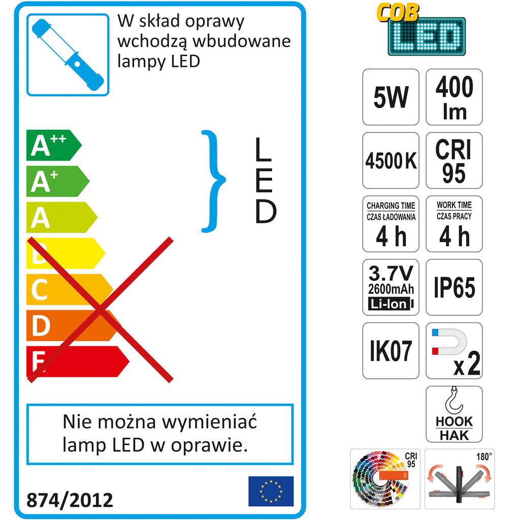 DE TRABAJO RECARGABLE MULTIFUNCIÓN DE 5W; CRI 95; 3.7V 2600MAH LI-ION BATERÍA; IP 65; INTERRUPTOR: PASO 1- 400 LÚMENES, TIEMPO DE TRABAJO 2HRS, PASO 2- 200 LÚMENES, TIEMPO DE TRABAJO 4HRS; TIEMPO DE CARGA: ESTACIÓN DE CARGA DE 4 HORAS CON BASE DE CARGA