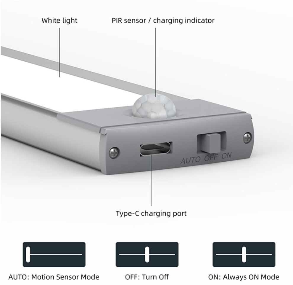 Lámpara LED con Sensor de Movimiento. Luz Inalámbrica Carga Rápida y 2 Modos. 23.3*4.3*1.2cm