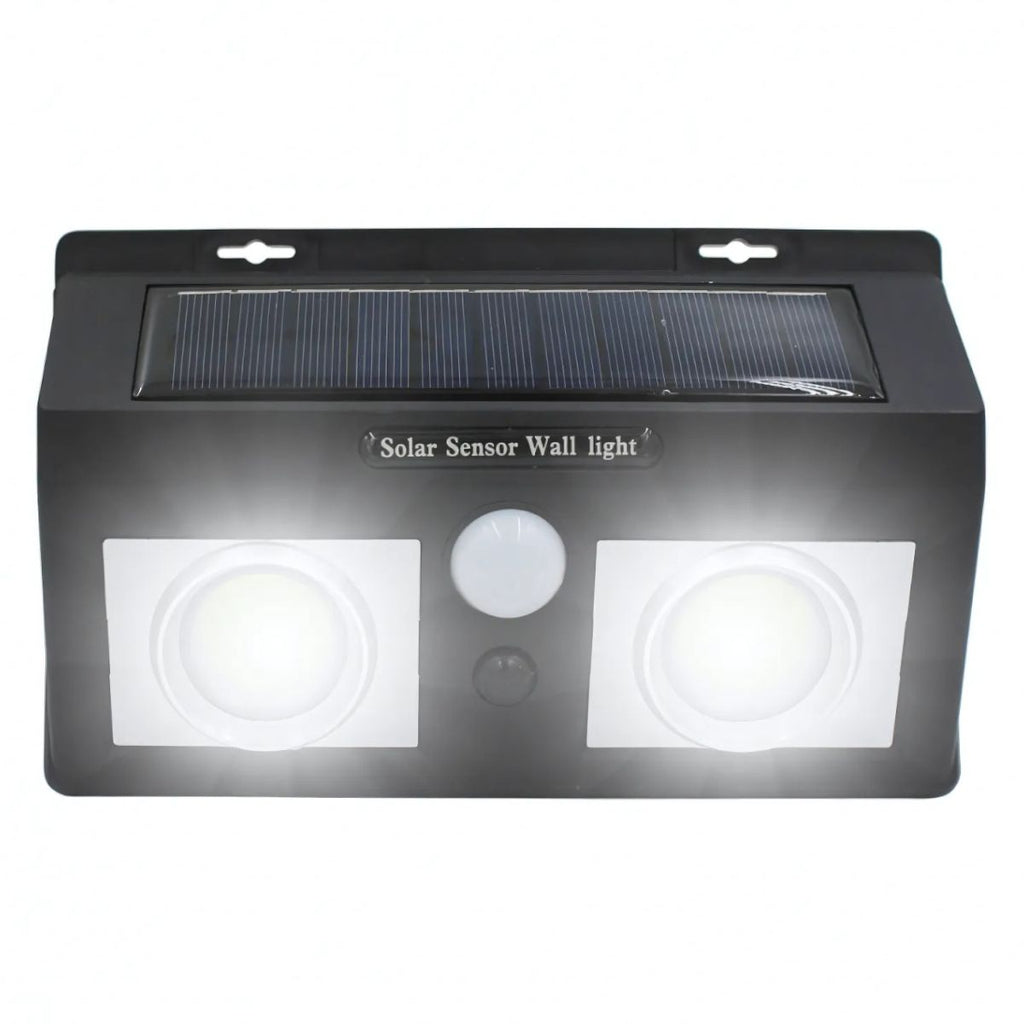 Lampara solar LED para exterior con sensor de movimiento. Foco de pared con panel solar. Luz blanca para jardines o patios.