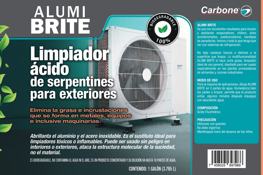 - El Alumi Brite limina la grasa e incrustaciones que se forma en metales, equipos y maquinaria.