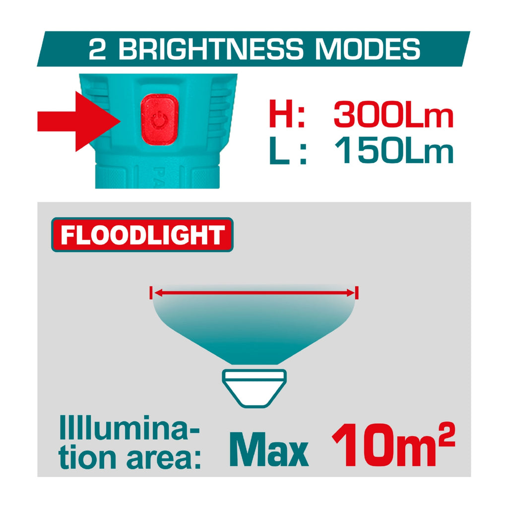 No brinda una buena iluminación ya tenemos dos de estas lámpara excelentes en su dos niveles de intensidad y su tercera función brinda una luz parpadeante excelente para realizar señales en casos de emergencia