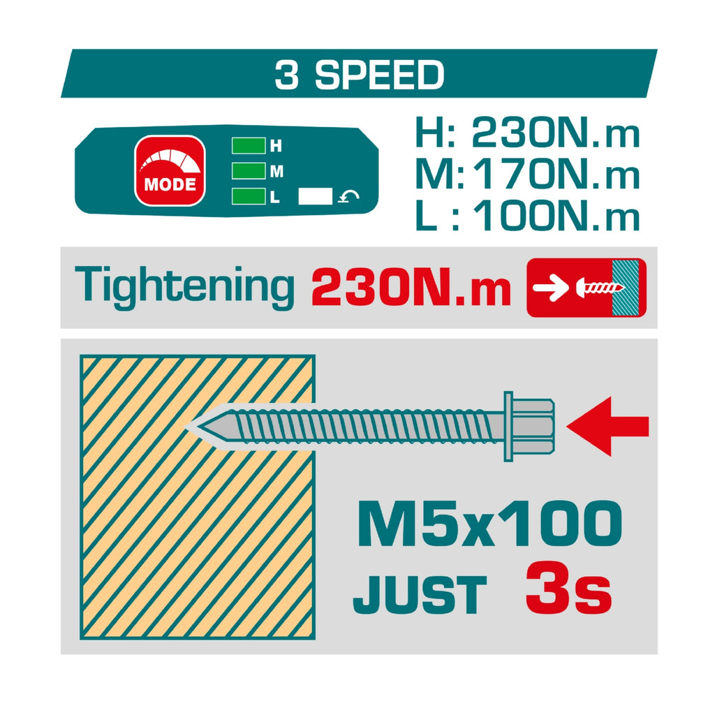 | Características | Motor sin escobillas. Velocidad sin carga: 0-2000/0-2400/0-2600rpm. Tasa de impacto: 0-2100/0-2500/0-2900bpm. Par máximo: 230 Nm. |