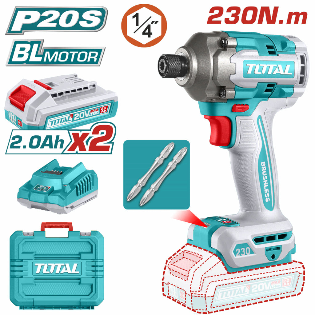 Llave de impacto dado hexagonal 1/4'' 20V 230Nm Motor sin escobillas. Incluye Batería y cargador.