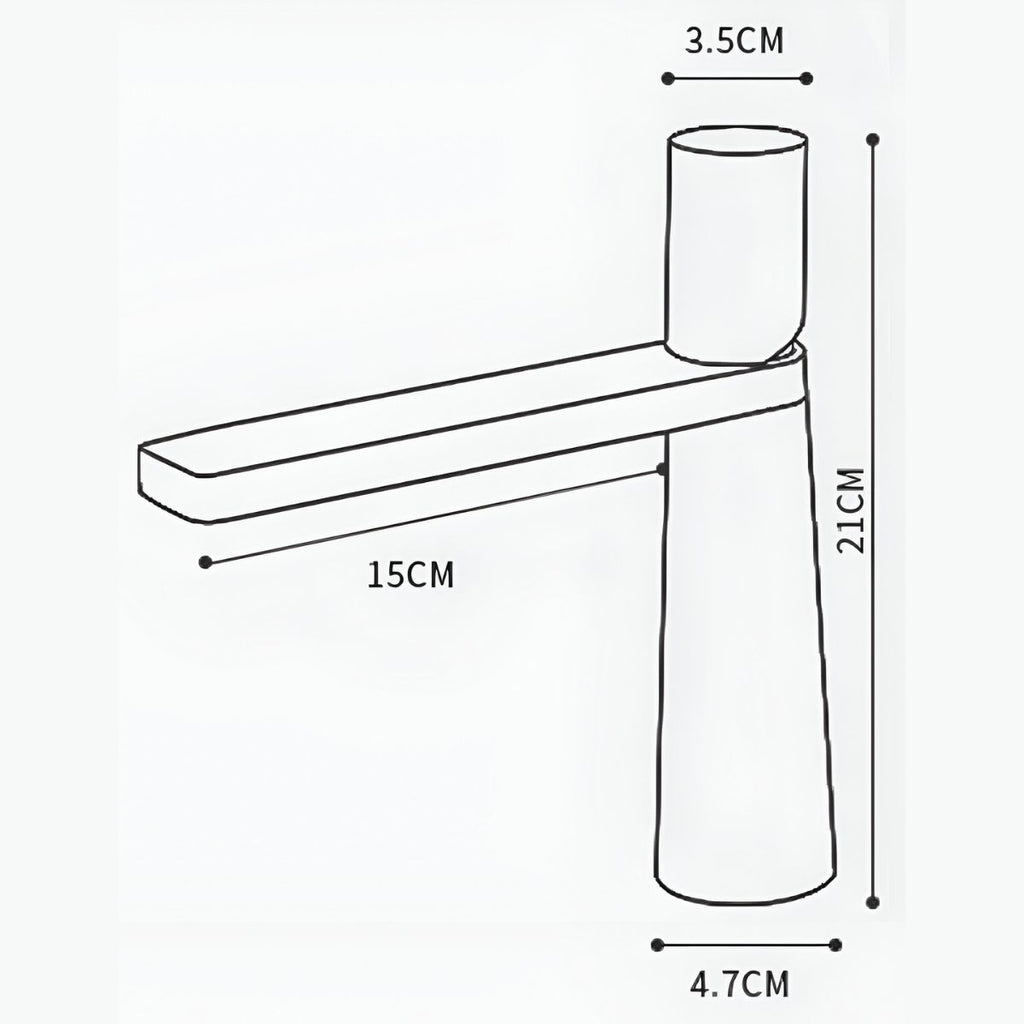 3.5cm (diámetro superior) x 21cm (altura total) x 4.7cm (diámetro base) con un alcance de 15cm (longitud del caño).