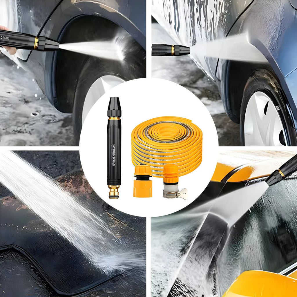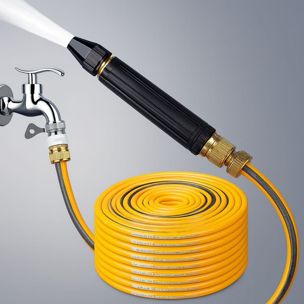 - Set completo: incluye manguera de 10 metros, boquilla de presión regulable y conectores de latón.