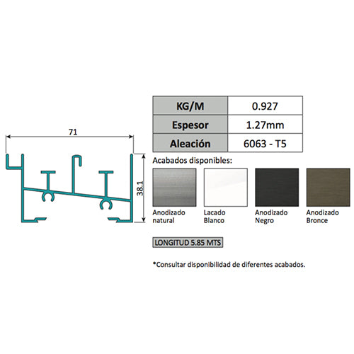 Marco Inferior Ventana VC mosquitero. Espesor 1.27 mm Largo 5.85 mts. Acabado Anonizado Natural VC122