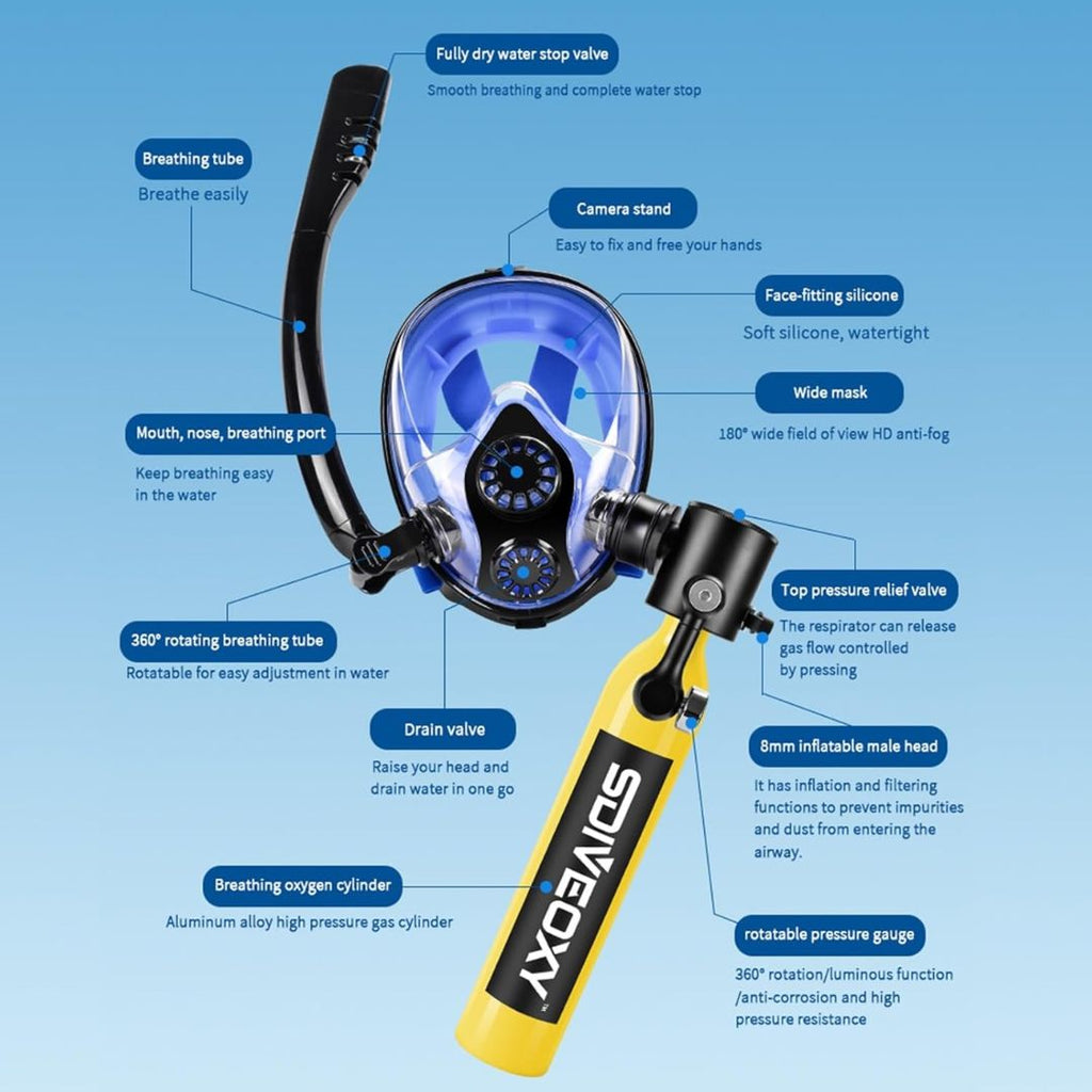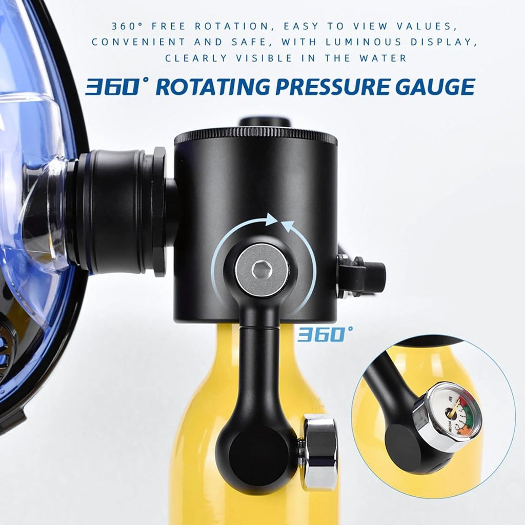 - Compatible con apnea y snorkel: Al conectarse al tanque, ofrece entre 6 y 10 minutos de respiración. Perfecto para sumergirse hasta 30 pies y explorar sin esfuerzo.