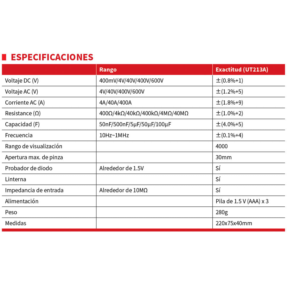 El UT213A es un medidor digital de pinza 400A con estándares de seguridad CAT III 600V. Estos medidores están diseñados para un mayor rendimiento y calificaciones de seguridad. La linterna incorporada también hace que estos medidores sean herramientas útiles cuando se trabaja en entornos oscuros.