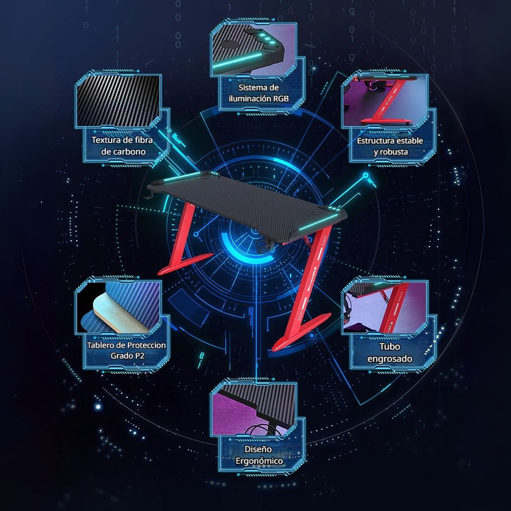 - Mesa gamer / escritorio para gaming con sistema de iluminación ambiental RGB con 12 colores y 5 niveles de brillo.
