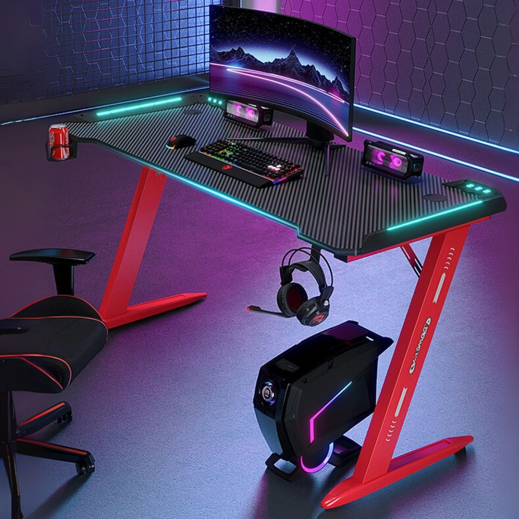 Escritorio Gamer Con Iluminación RGB, Fibra De Carbono. Posavasos y Soporte Para Auriculares. Negro y Rojo.100x160x74 cm.