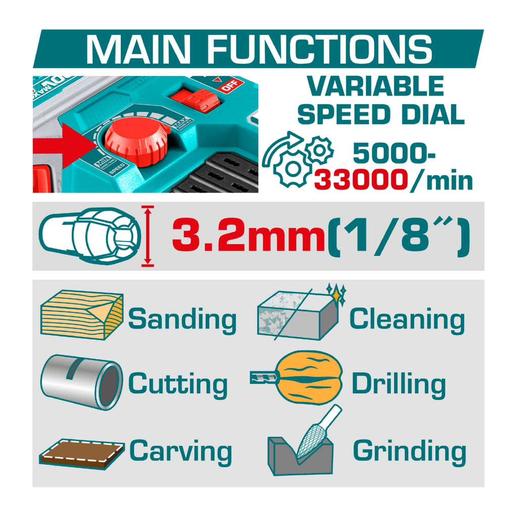 | Características | Control de velocidad variable. Tamaño del casquillo: 3.2mm/2.3mm. Incluye 40 piezas de accesorios. |