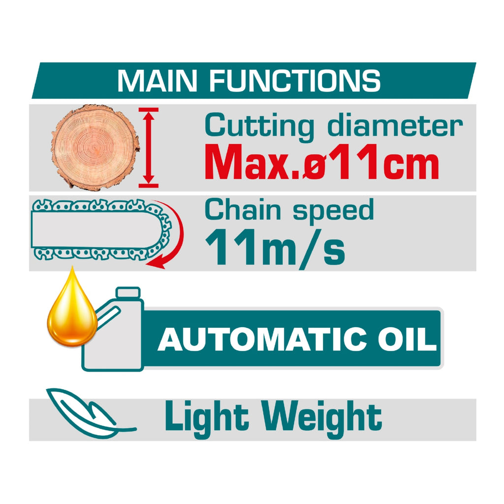 | Incluye | Cadena de sierra, barra de motosierra.Cuenta con un freno electrónico para evitar que la cadena gire una vez que se suelta el gatillo. |