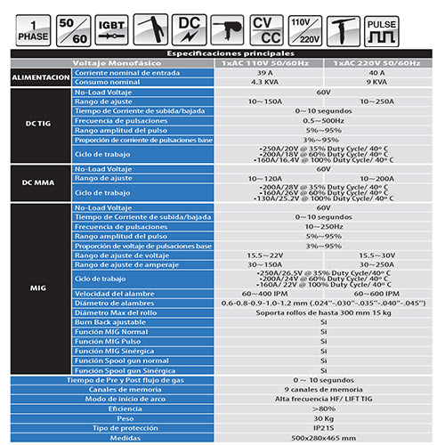 | Ciclo de Trabajo DC TIG | 250A/20V @ 35% Duty Cycle/ 40º C; 200A/18V @ 60% Duty Cycle/ 40º C; 160A/16.4V @ 100% Duty Cycle/ 40º C |