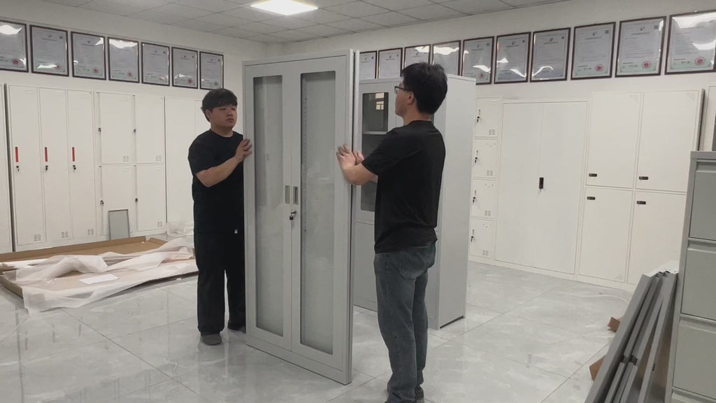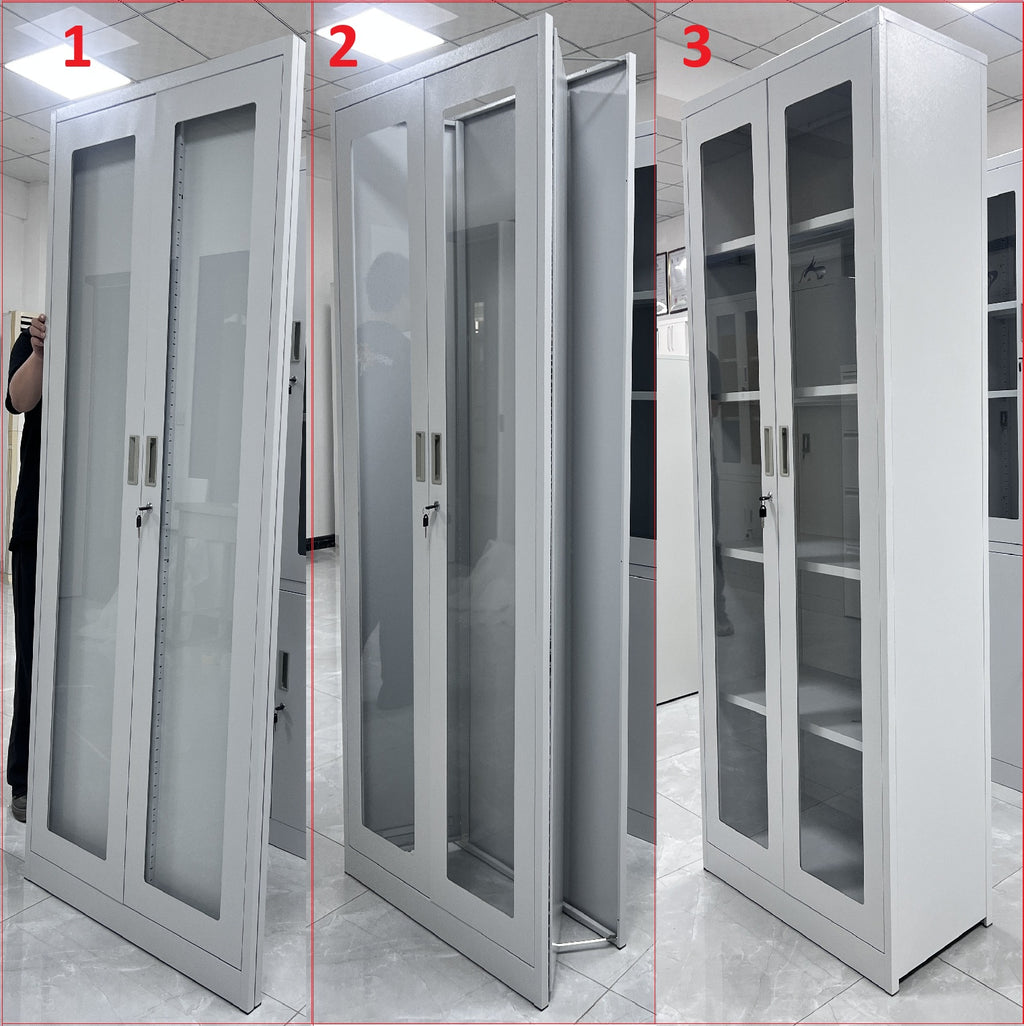 Mueble metalico Gabinete armado estructura plegable con 4 estantes ajustables doble puerta de vidrio y cierre con llave 1850x900x400mm