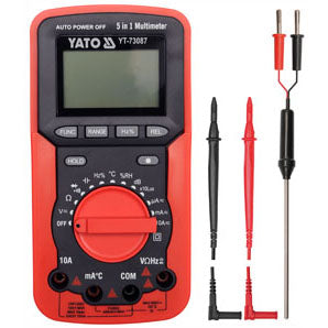 Yato Multimetro Digital 5 En 1 Con Autorrango - Voltaje Dc: 0.4/4/40/400/400/600V; Voltaje Ac: 4/40/400/600V; Corriente Dc: 400?/4000?/40M/400M/10A; Corriente Ac: 400?4000?/40 M/400M/10A; Resistencia: 400/4K/40K/400K/4M/40M?; Capacitancia: 4N/40N/400N/
