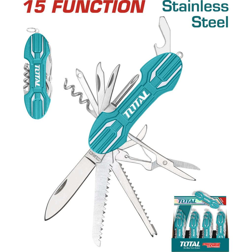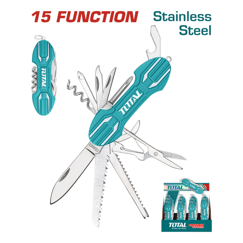 Navaja multifuncional de 15 operaciones Tijeras, serrucho, destornillador y mas, mango de aluminio endurecido.