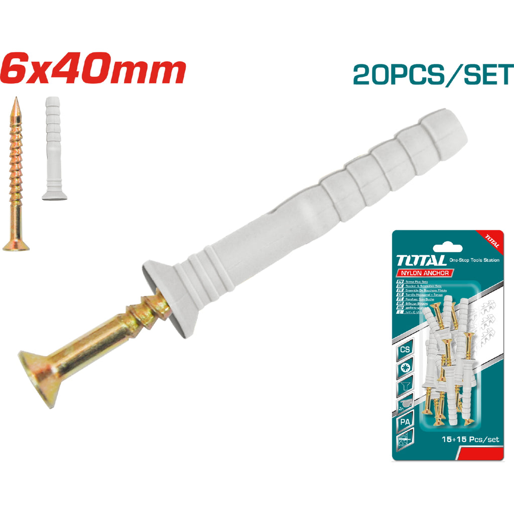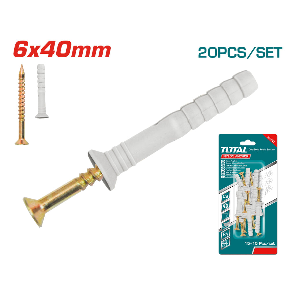 (20 unidades) Juego de Tacos de anclaje Taco de nilón, 6x40mm, Tornillo Estrella cabeza cónica (Pozi drive). Blíster.